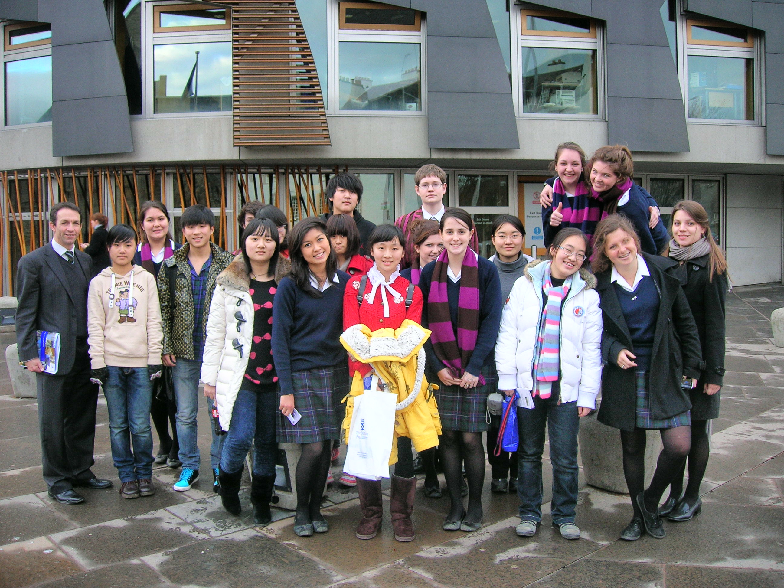 今年寒假(2011年1月),作为扬州中学国际班的一员,我参与了扬州中学与英国爱丁堡费特斯学院的第一次交流活动,成功参与了访问与接待工作。