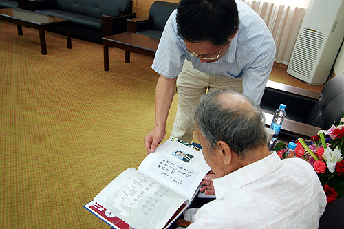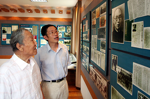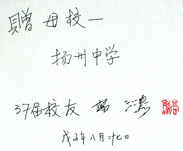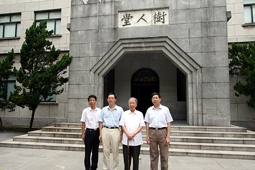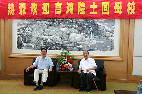 “父亲虽已9旬,但身体尚好。父亲屡次提到要回扬中看看,因为天气炎热,给我们阻挡了。近来一周南京天气较凉爽,父亲想在学校方便的时间,再次拜访母校。”高苓女士在给学校的电子邮件中如是说。8月27日,怀着对母校的深厚感情,90岁高龄的我校1937届校友高鸿院士在女儿高苓的陪伴下终于回到他朝思暮想的母校。 卫刚校长、张发祥书记、方钧鹤副校长、朱如忠副校长和校友办公室的负责同志在树人堂前欢迎高鸿院士的到来。卫校长向高院士介绍了学校的发展情况,高院士不停地点头称好。他说,学校越来越好了,学校也越来越漂亮了。在参观校史陈列馆时,高院士连声说:“好,好!这样好,总结历史是为了更好的开创未来。”走出校史陈列馆,老院士深情地说:“我很感激扬州中学!” 高鸿院士向母校赠送了《志庆集》。今年6月南大和西南联大的一些老师们联合为他编辑了一本《志庆集》,以庆祝高院士90岁生日。《志庆集》书中有高院士90年代写的对童年和中学时代的回忆文章,其中包括对就读的扬州中学的赞扬。书中还有一张高院士保留的1937年6月扬州中学师生合影的珍贵的照片。 卫校长向高院士赠送了《树人堂下》和学校的有关资料。