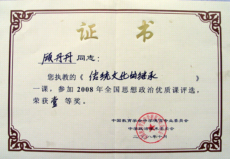 <P>2008年9月我校政治组顾丹丹老师在“江苏省思想政治优质课评选活动”中荣获一等奖第一名,10月26日她代表江苏省参加“2008年全国思想政治优质课评选活动”,荣获全国一等奖。</P> <P align=center><A href="$/History/main/Article/Uploadfiles/200810/20081030161356207.jpg" target=_blank><IMG onmousewheel="return bbimg(this)" height=554 src="$/History/main/Article/Uploadfiles/200810/20081030161356207.jpg" width=800 onload=resizepic(this) border=0></P> <P align=center> </A></P>