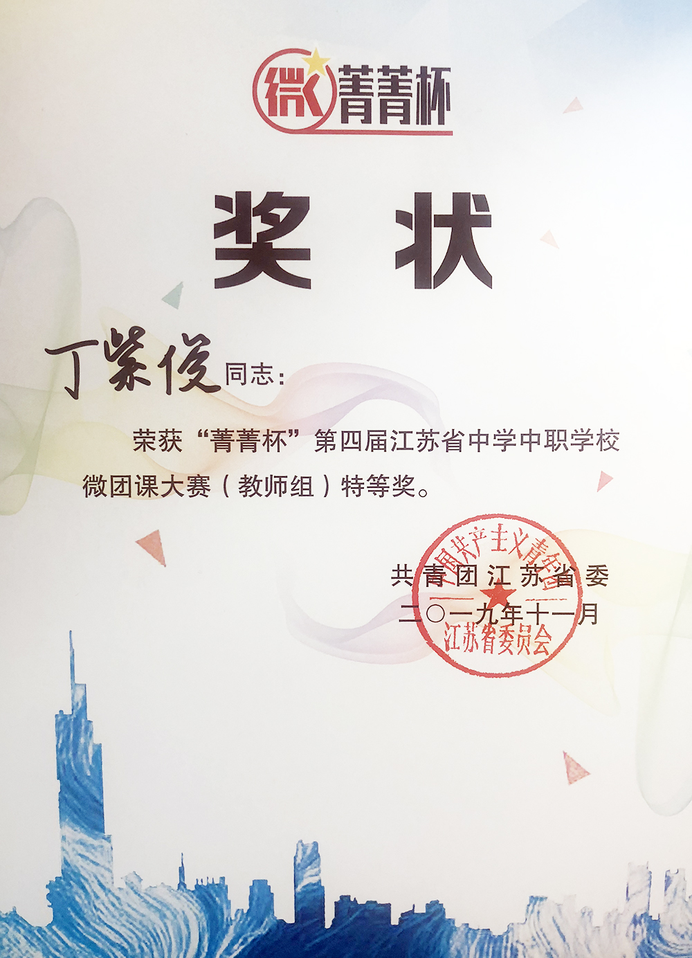 11月28-29日,由共青团江苏省委员会主办、共青团苏州市委员会承办的2019年“菁菁杯”第四届江苏省中学中职学校微团课大赛在苏州举行,全省13个地级市共26名教师和26名学生参加总决赛。经过激烈的角逐,我校思政教师丁紫俊荣获特等奖,学生王逸洲荣获二等奖。