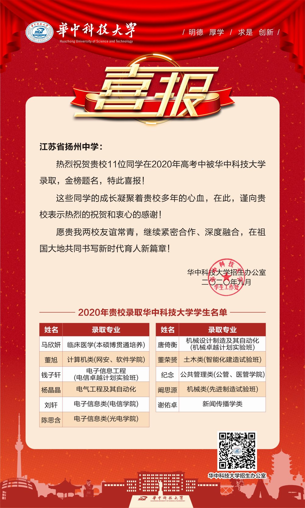 近日,国家“211工程”重点建设和“985工程”建设高校之一,首批“双一流”建设高校华中科技大学向我校发来喜报,感谢我校多年来向该校输送了大批品学兼优的学生,他们进入大学后,锐意进取,全面发展,再接再厉,取得了优异的成绩,特感谢我校多年的心血付出!华中科技大学在喜报中期望与我校继续加强合作,共同进步,为培养更多拔尖创新人才做出贡献,共同书写新时代育人新篇章!
