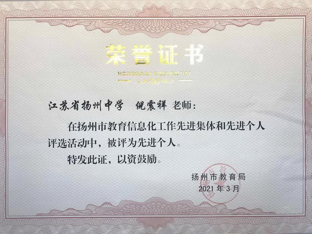 在近期结束的2021扬州市智慧教育建设工作推进会上,我校倪震祥老师被评为“扬州市教育信息化工作先进个人”。
