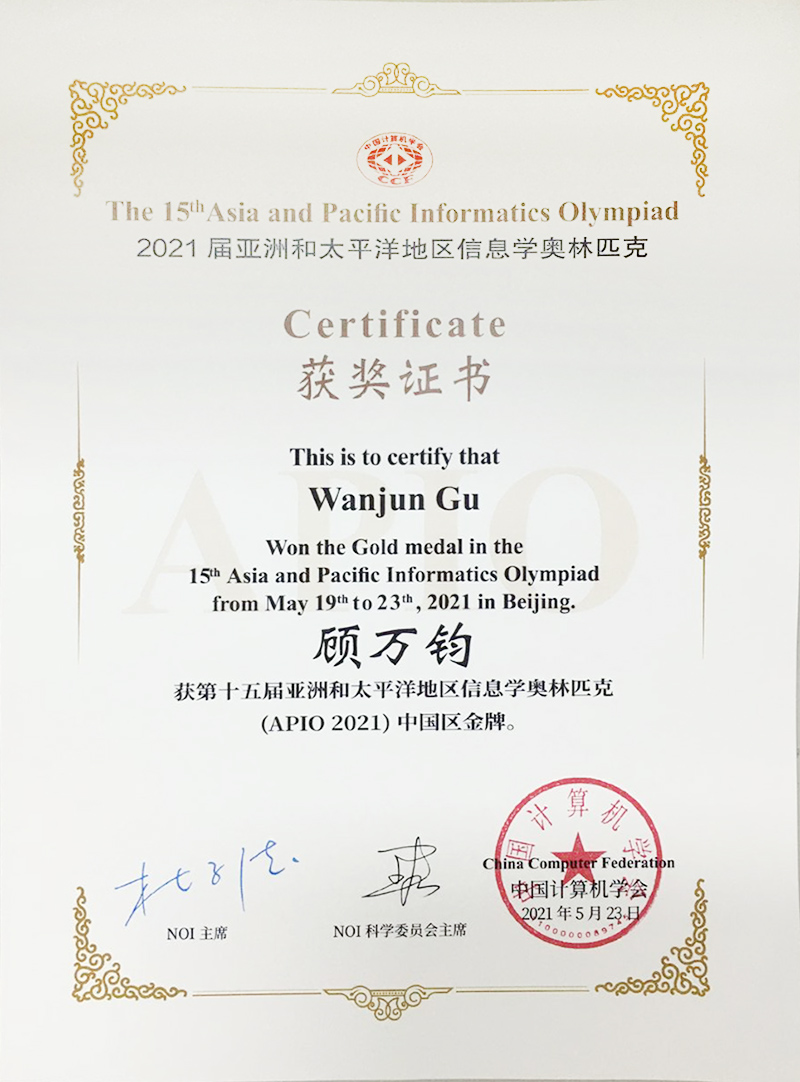 我校学生顾万钧喜获亚太信息学比赛(APIO2021)中国区金牌