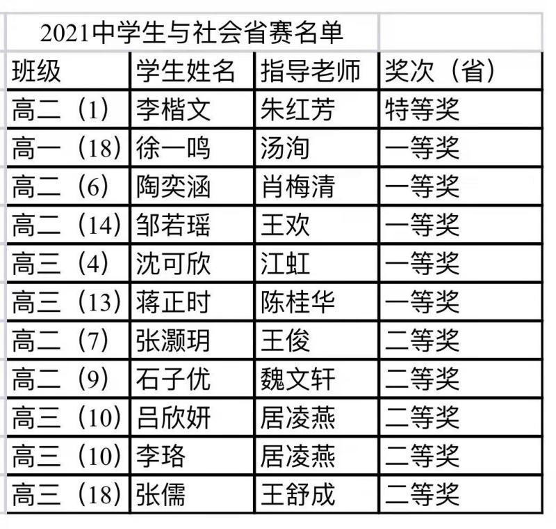 <P><FONT size=4>12月18日,江苏省第二十届“中学生与社会”作文大赛省级决赛(扬州赛区)在扬州市竹西中学举行。在此次比赛中,我校十一位学生喜获佳绩。其中高二(1)班的李楷文同学荣获省级特等奖。高一(18)班的徐一鸣、高二(6)班陶奕涵、高二(14)班的邹若瑶、高三(4)班的沈可欣,高三(13)班的蒋正时喜获省级一等奖。此外,高二(7)班的张灏玥、高二(9)班的石子优、高三(10)班的吕欣妍、高三(10)班的李珞、高三(18)班的张儒喜获省级二等奖。</FONT></P> <P align=center><IMG alt="" hspace=0 src="$/History/main/Article/Uploadfiles/202112/20211228154127181.jpg" border=0><BR><BR></P>