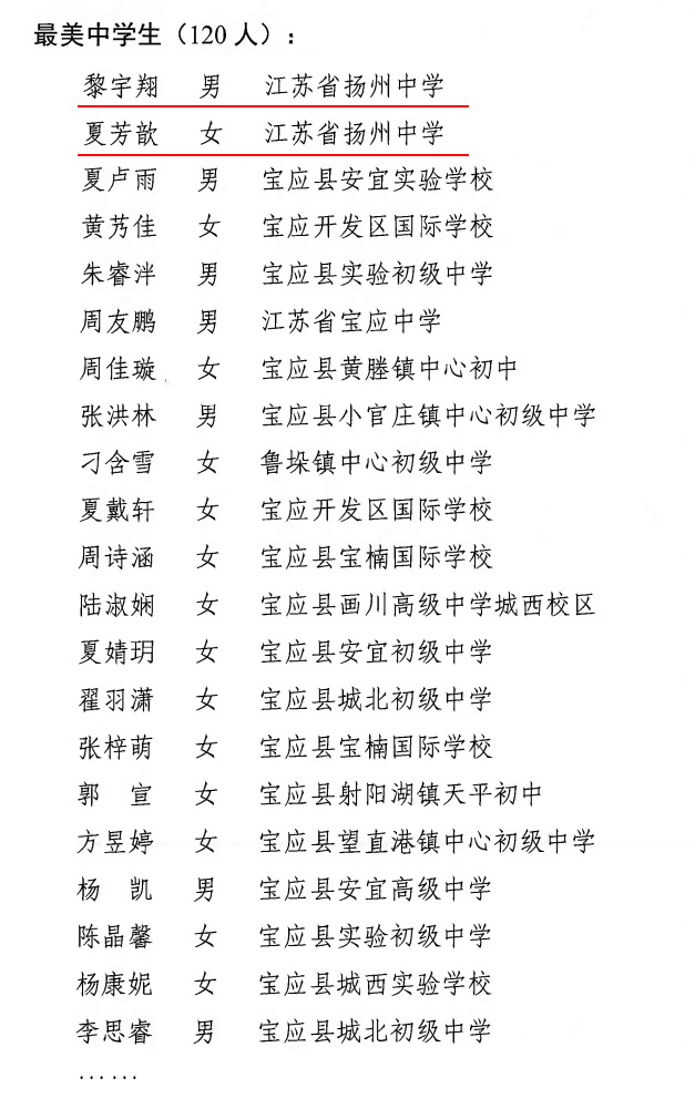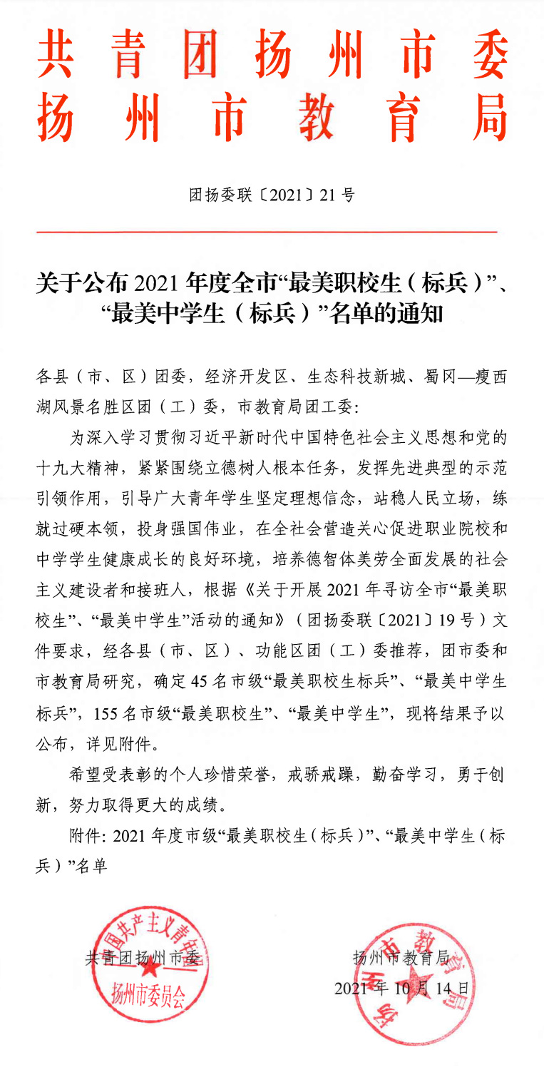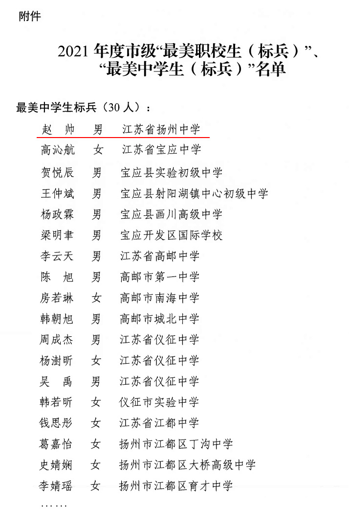 近日,扬州市寻访2021年度最美中学生活动结果正式揭晓,我校赵帅同学被授予“扬州市最美中学生标兵”荣誉称号,黎宇翔、夏芳歆同学被授予“扬州市最美中学生”荣誉称号。