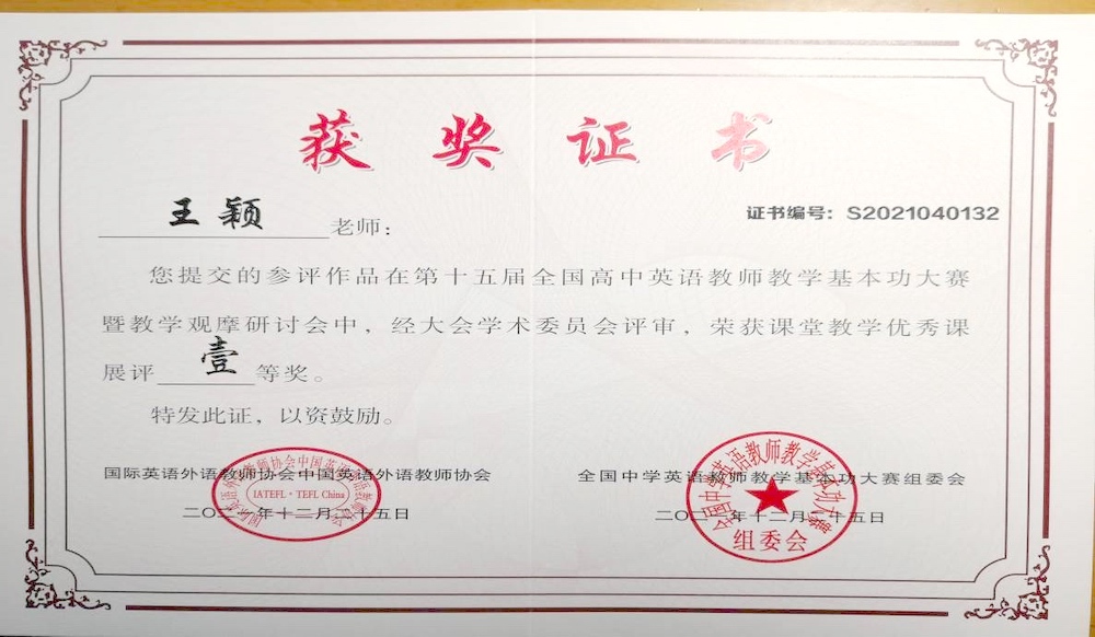 <P><FONT size=4>近日,在第十五届全国高中英语教师教学基本功大赛暨教学观摩研讨会中,江苏省扬州中学王颖老师荣获课堂教学优秀课展评一等奖,指导老师丁薇薇、刘人杰老师获“优秀指导教师”荣誉称号。</FONT></P> <P><FONT size=4>继本月初获得江苏省高中英语优质课大赛一等奖后,王颖老师更进一步,斩获全国一等奖,充分展现了扬州中学年轻教师的扎实的基本功与勇于拼搏的精神。</FONT></P> <P><IMG alt="" hspace=0 src="$/History/main/Article/Uploadfiles/202201/20220125004743558.jpg" border=0><BR><BR><IMG alt="" hspace=0 src="$/History/main/Article/Uploadfiles/202201/20220125004743903.jpg" border=0><BR><BR></P>