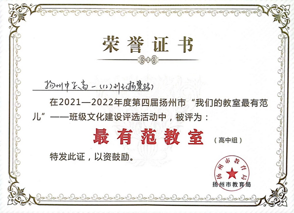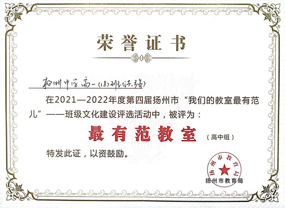 5月19日,在扬州市第四届“我们的教室最有范儿”教室文化建设现场评选活动中,我校洪强老师所带的高一(18)班、杨翼铭老师所带的高一(12)班被评为“最有范教室”。