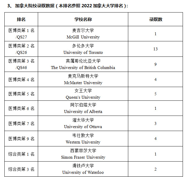 在申请加拿大的15名同学中,13人被医博类排名前3的麦吉尔大学、多伦多大学和英属哥伦比亚大学(同时也是QS世界排名前50名大学)录取 ,占比87%,比以往任何一年都好。