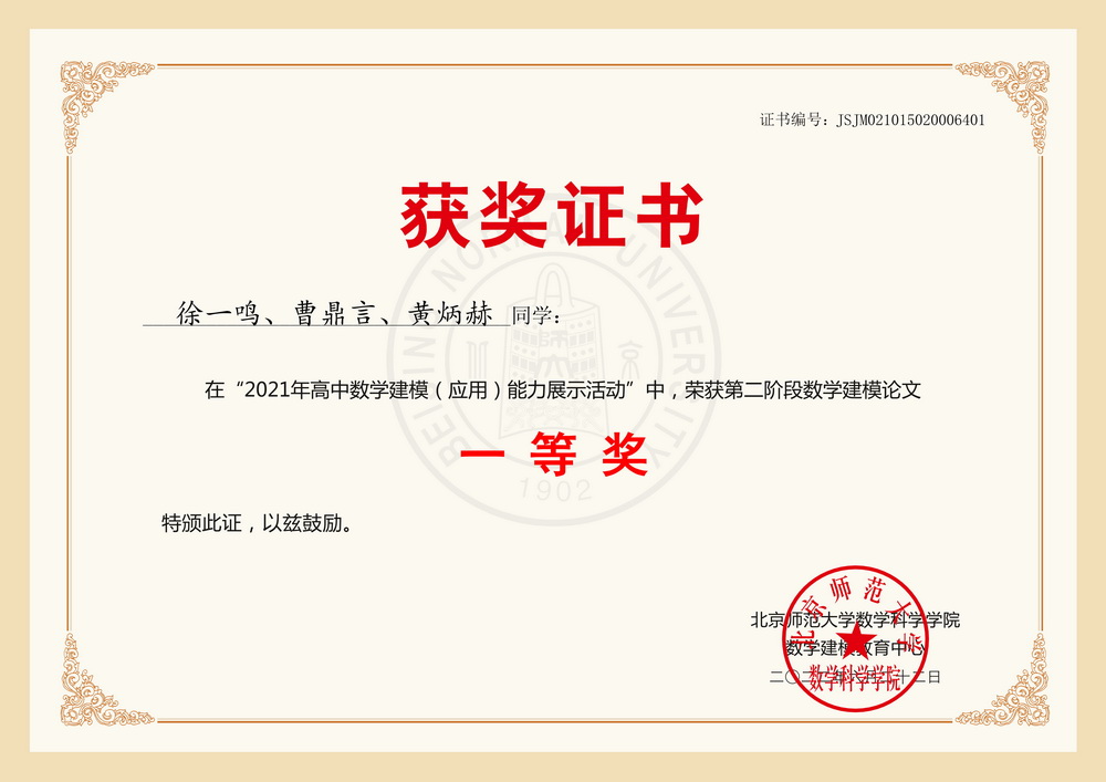 <P><FONT size=4>近日,第二届全国高中数学建模(能力)展示活动第二阶段(论文评比)获奖结果公布,我校高一、高二年级同学获得了骄人的成绩,其中早培高一的朱晋乐、仲骐禾、钱昱文的论文《关于图书馆书籍最佳更新周期的研究》,早培高二的徐一鸣、曹鼎言、黄炳赫的论文《运用SNA分析交际圈中的中心人物与枢纽人物——以虚拟主播为例》双双获得全国一等奖。 我校也被评为建模活动优秀组织奖。</FONT></P> <P><IMG alt="" hspace=0 src="$/History/main/Article/Uploadfiles/202207/20220731112635561.jpg" border=0><BR><BR><IMG alt="" hspace=0 src="$/History/main/Article/Uploadfiles/202207/20220731112635486.jpg" border=0><BR><BR></P>