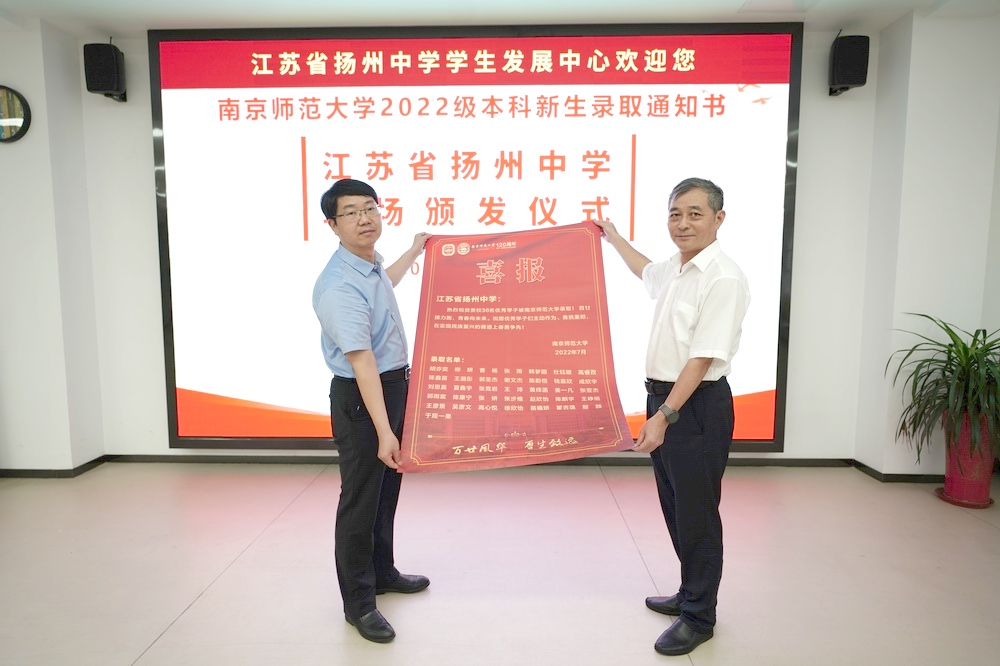 7月25日上午,南京师范大学党委常委、副校长李久生,地理科学院党委书记苏锦、副书记周娅、副校长陈霞、团委书记陆琰,亲临我校,为今年考取南京师范大学的36名扬中学子现场颁发录取通知书。江苏省扬州中学校长薛义荣、高三年管会主任王辉林参加了录取通知书颁发仪式,江苏省扬州中学纪委陈桂华书记主持。
