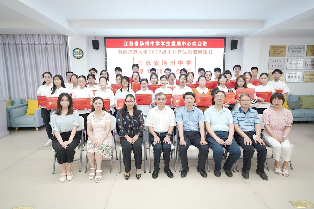 仪式结束之后,扬州中学与会师生与南京师范大学领导老师合影留念。南京师范大学李久生副校长还向扬州中学薛义荣校长赠送了录取喜报。