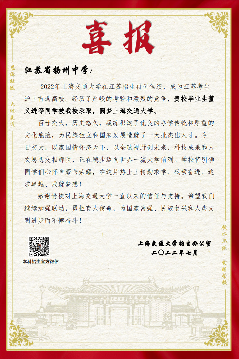 <P align=left><FONT size=4>近日,上海交通大学向我校发来喜报,祝贺我校今年高考大丰收,董义进等19名学子圆满</FONT><A name=_GoBack></A><FONT size=4>上海交通大学。</FONT> <P align=center><IMG alt="" hspace=0 src="$/History/main/Article/Uploadfiles/202207/20220731120458952.jpg" border=0><BR><BR><IMG alt="" hspace=0 src="$/History/main/Article/Uploadfiles/202207/20220731120458841.jpg" border=0><BR><BR></P>