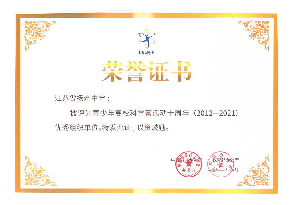 青少年高校科学营由中国科协和教育部共同主办,旨在充分发挥高校在传播科学知识、科学思想、科学方法和提高青少年科学素质方面的功能,自2012年起每年组织全国各地优秀的高中生走进高校开展科技体验活动。10年来,学校科技辅导员谢晓石老师两次为省科学营“营前辅导会”开设讲座,邵伟红等9位老师获科学营优秀辅导员称号。学校通过“用手思考”拓展课结合学生个人能力选拔了300位学生参加科学营活动,其中37人在高校科学营各项评比中获表彰。江苏省扬州中学能在本次“10周年”总结表彰活动中脱颖而出成为最终获奖的23家单位之一,和“扬中人”对科技的执着追求是分不开的。学校也希望在以后的科学营活动中继续努力,选拔更多优秀学生参加活动,增强学生科学兴趣,服务国家创新战略。