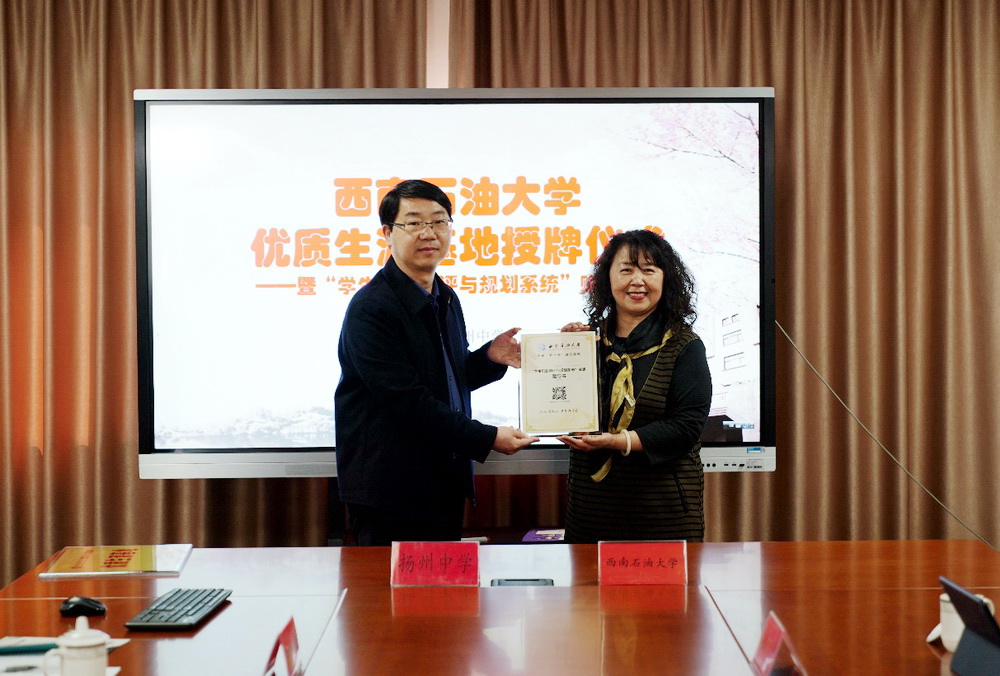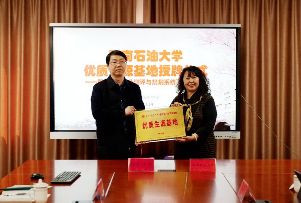 3月14日下午,西南石油大学与我校在第一会议室开展交流合作,举行了“西南石油大学优质生源基地”授牌仪式。出席本次活动的有西南石油大学党委副书记、工会主席衡彤一行,扬州中学薛义荣校长、丁爱军副校长、学工处王辉林主任和高三年级组孙干副主任等。