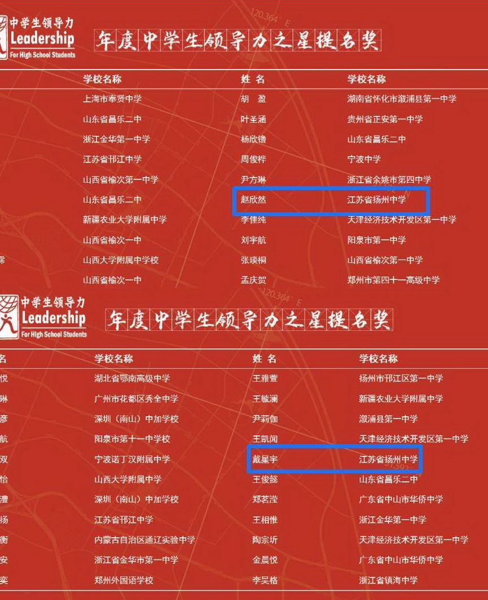 7月28日--8月3日,第十四届全国中学生领导力展示会在江苏省天一中学举行,全国各地共有105个项目,近千名师生、志愿者汇聚于此,江苏省扬州中学荣获“学校特等奖”。