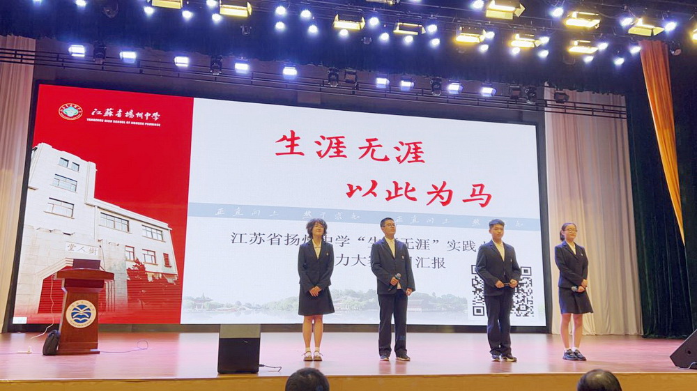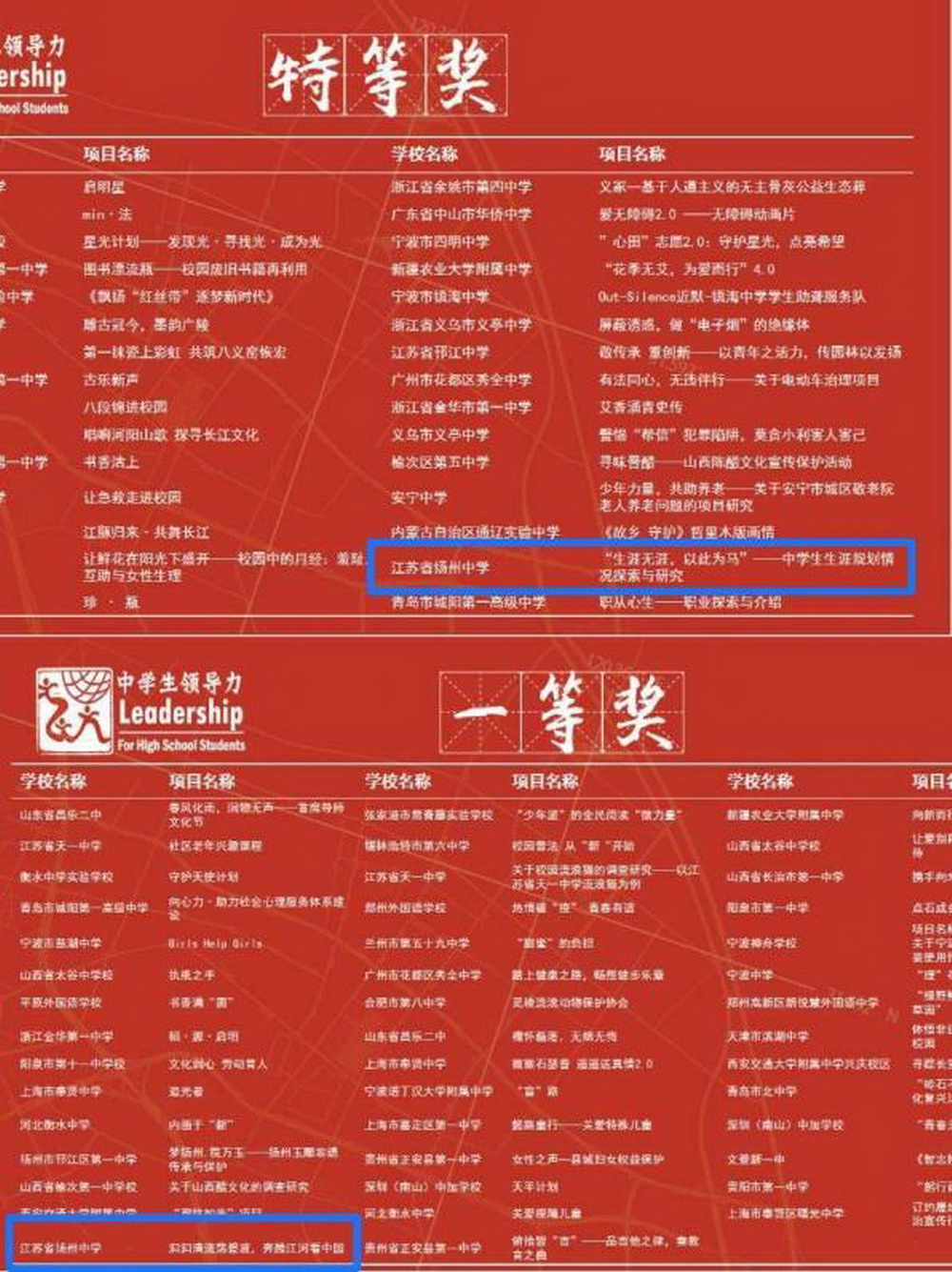 《生涯无涯,以此为马——中学生生涯规划情况探索与研究》项目,以学生为本,以现实为基,以未来为向,普高与职高共发展,创办“生涯无涯”公众号,以“学长学姐说”的方式为大家提供科学而又亲切的生涯规划指导。《汩汩清流荡碧波,奔腾江河看中国》项目组立足于京杭大运河扬州段,向社会宣传京杭大运河文化与环境保护。他们通过问卷统计、实地调查等活动,成员相互合作,各取所长,高质量完成了领导力大赛项目的展示。