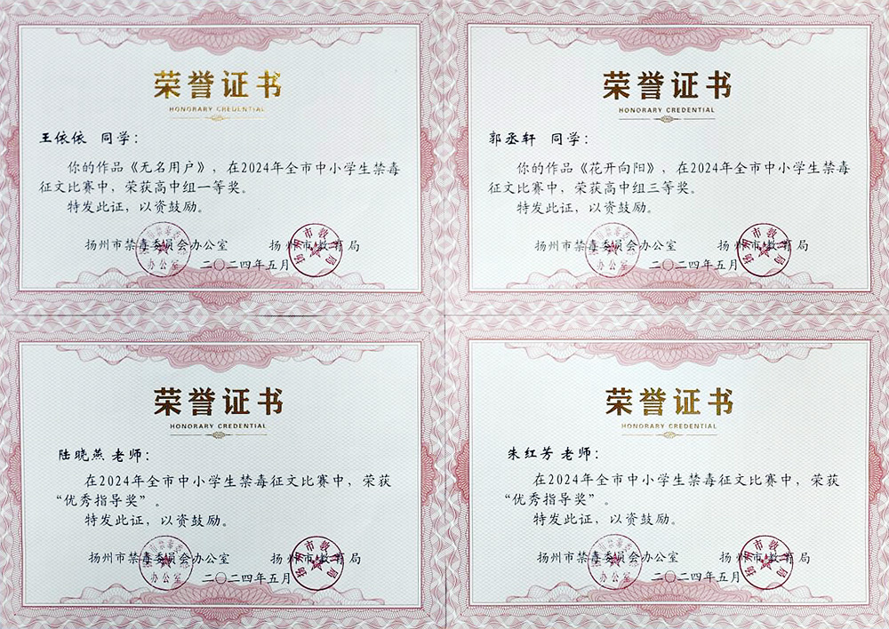 为深入贯彻习近平总书记关于禁毒工作的重要指示精神,积极响应国家、省、市禁毒工作会议的号召,充分发挥学校在青少年毒品预防教育工作中的主阵地作用,全面提升毒品预防教育工作水平,2024年4月扬州市禁毒委员会联合市教育局,在全市范围内组织开展了以“珍爱生命,远离毒品”为主题的禁毒征文比赛活动。