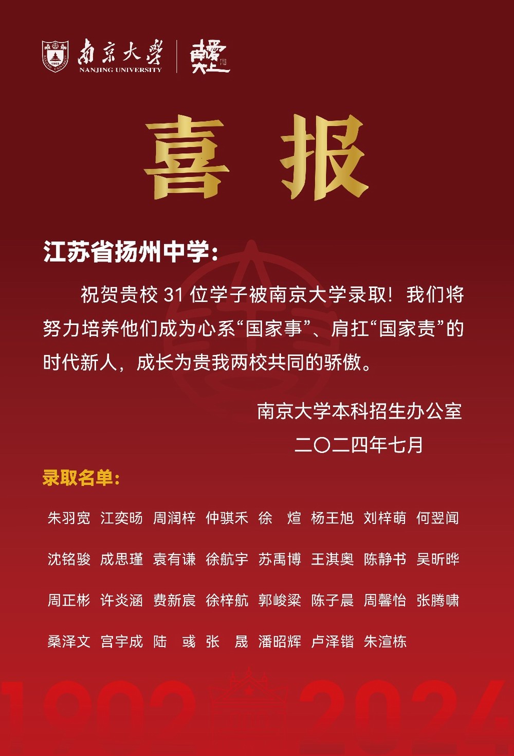 喜报!江苏省扬州中学31名学子正式成为“新南大人”