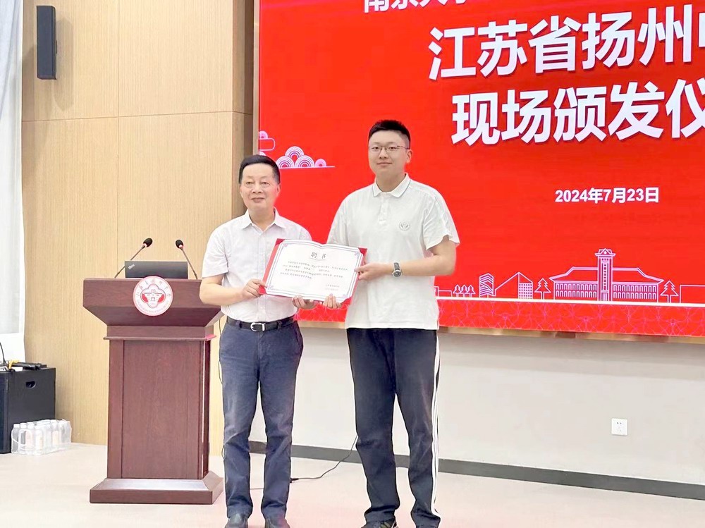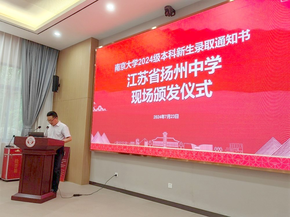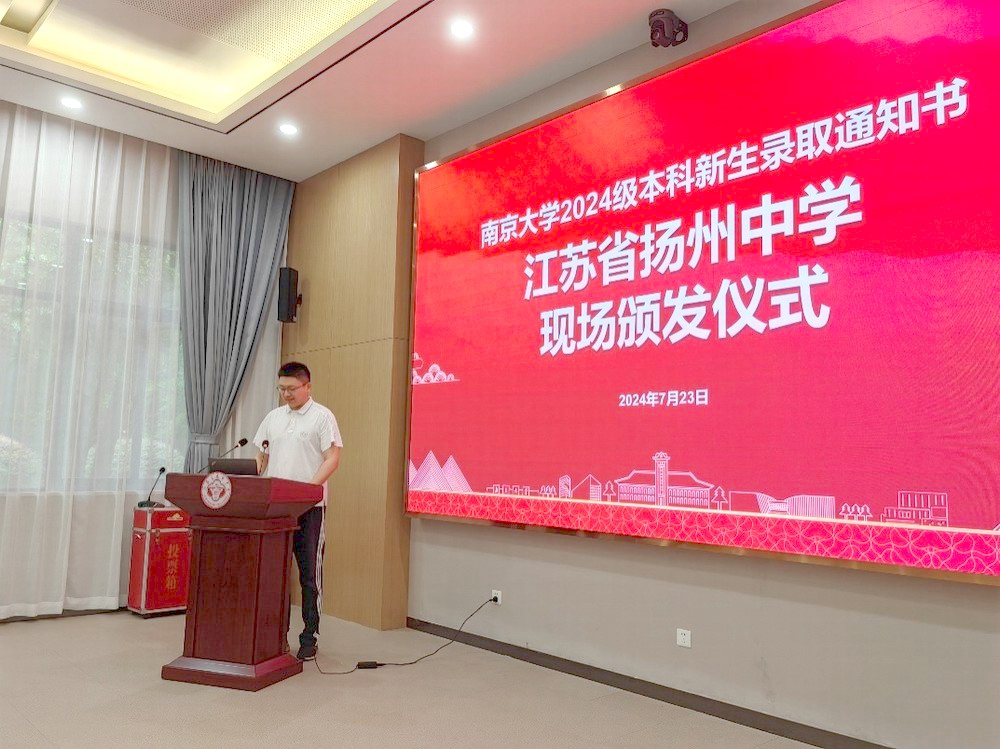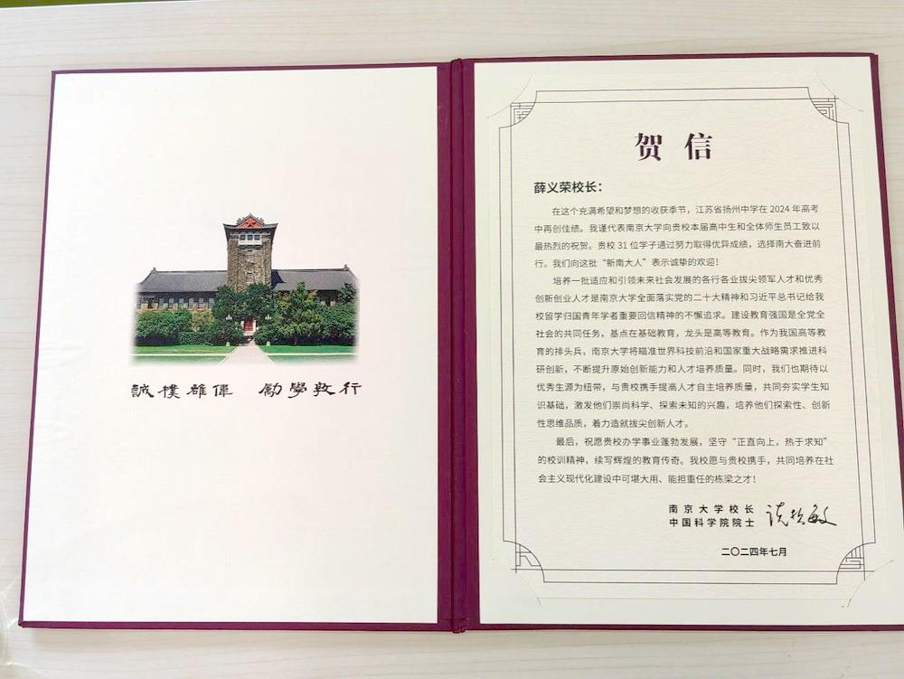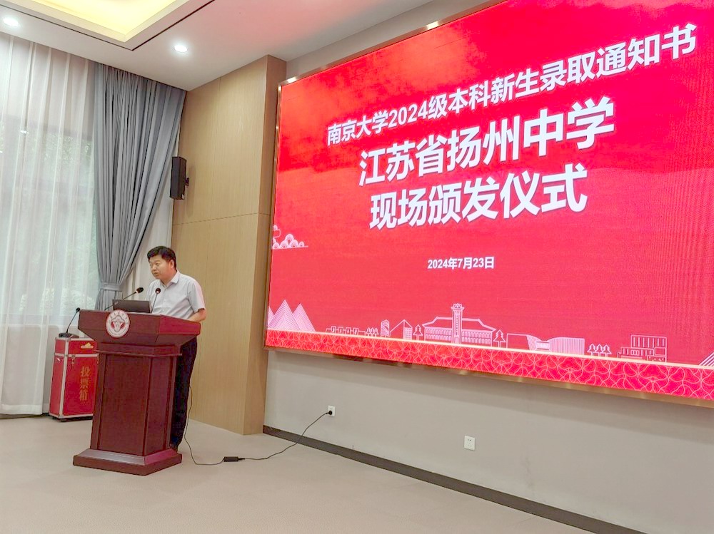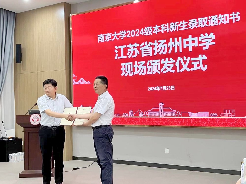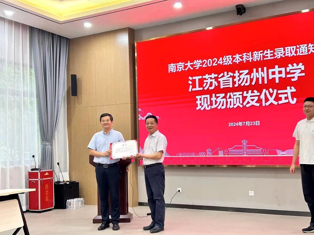 7月23日下午,南京大学党委常委、副校长陆现彩,数学学院教授、扬州招生组副组长邓卫兵,为我校31位南大2024级本科新生颁发录取通知书,并送来贺信和祝贺喜报。