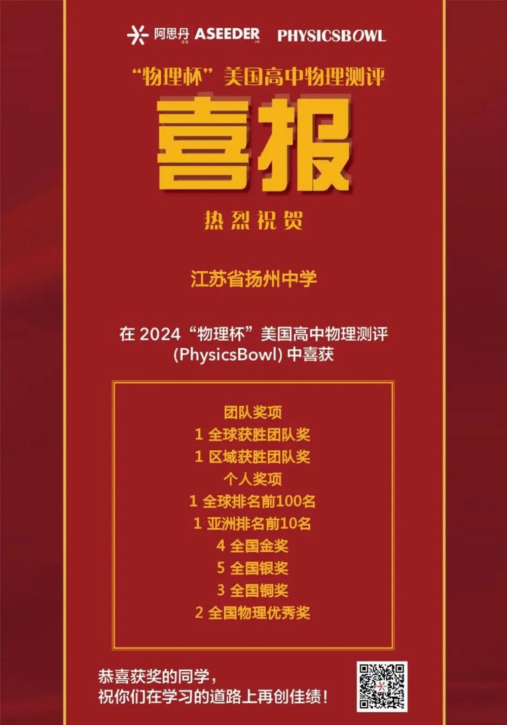 2024年“物理杯”美国高中物理测评成绩公布。我校学子再创辉煌,展现出了卓越的物理素养和团队协作精神。