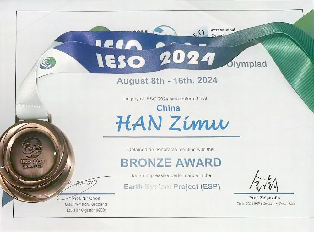在刚刚结束的国际地球科学奥林匹克竞赛2024全球总决赛中,我校韩子睦同学取得了个人赛Very Good,ESP(地球系统项目)铜奖的好成绩!