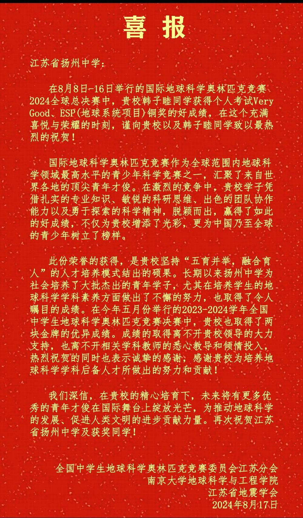 此前,在今年5月份的全国赛中,江苏赛区选拔出了17位同学,代表江苏省参加全国决赛,我校韩子睦和李凌俊经角逐成功入选省队,并斩获两枚金牌!韩子睦同学经层层选拔,最终凭借自身实力成功入选国家队,代表中国参加国际赛事。值得一提的是,江苏省仅有两位同学进入国家队。对韩子睦同学所取得的成绩表示热烈祝贺!对辛勤耕耘、默默付出的教师团队表示感谢!扬州中学将继续坚持“突出树人宗旨,努力服务社会”的优良办学传统,努力培养更多具有创新精神和实践能力的优秀人才。