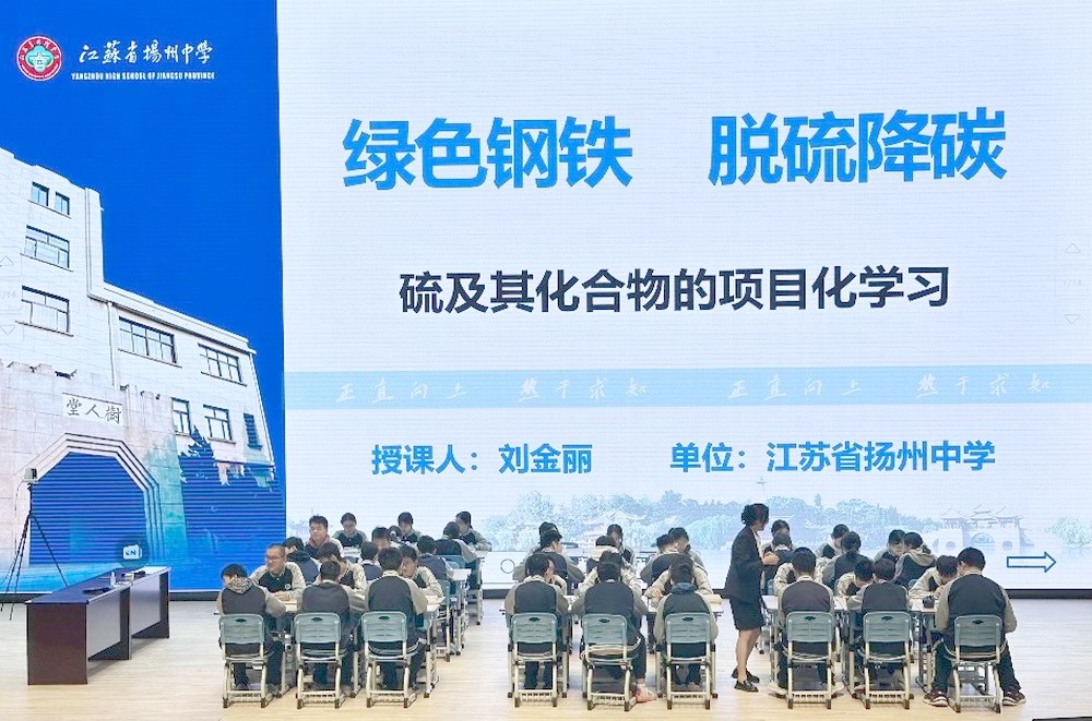 比赛过程中,刘金丽老师以“绿色钢铁,脱硫降碳”为主题,开展了硫及其化合物的项目化学习。课堂上,刘老师注重学生的知识建构、方法引领和思维提升,加深了学生对于化学学科本身以及基于真实情境工业生产过程的理解,跟同学们一起形成了《钢铁行业脱硫降碳行动报告》,最终获得了专家评委和观摩老师们的一致好评。