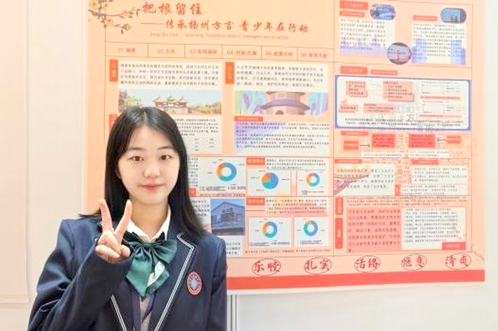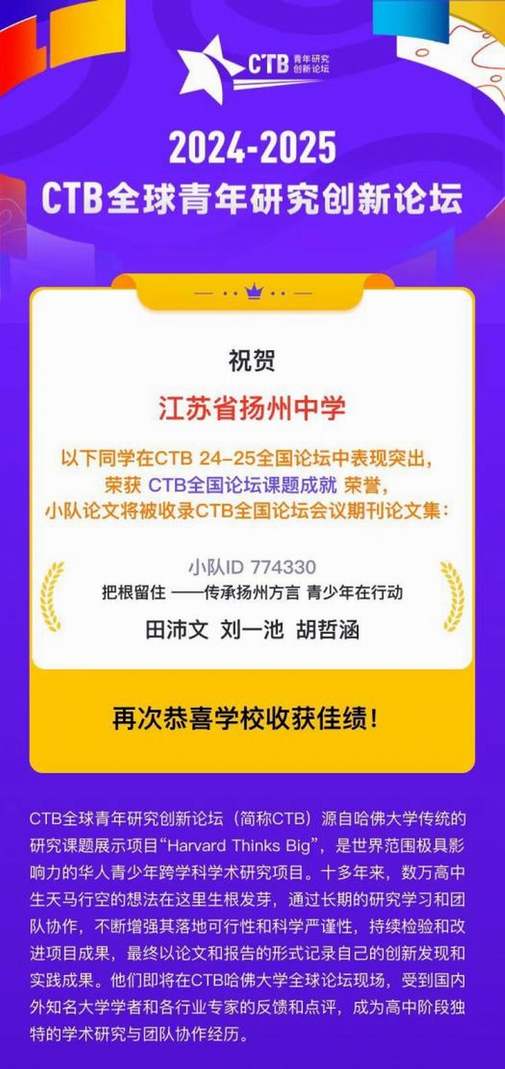 以文化守护叩响学术之门,用青年智慧书写传承担当。在2024-2025 CTB(China Thinks Big)全球青年研究创新论坛全国站中,我校国际班三位同学在队长田沛文的带领之下,从全国数千支参赛队伍中强势突围,凭借创新项目《把根留住——传承扬州方言,青少年在行动》荣膺全国“CTB全国论坛课题成就”及“全国论坛完成展演课题”大奖,项目论文被收录于全国电子图书馆。这一荣誉不仅是对扬州中学学生学术能力的权威认证,更标志着扬州本土文化保护和传承行动在青年创新领域的里程碑式突破。