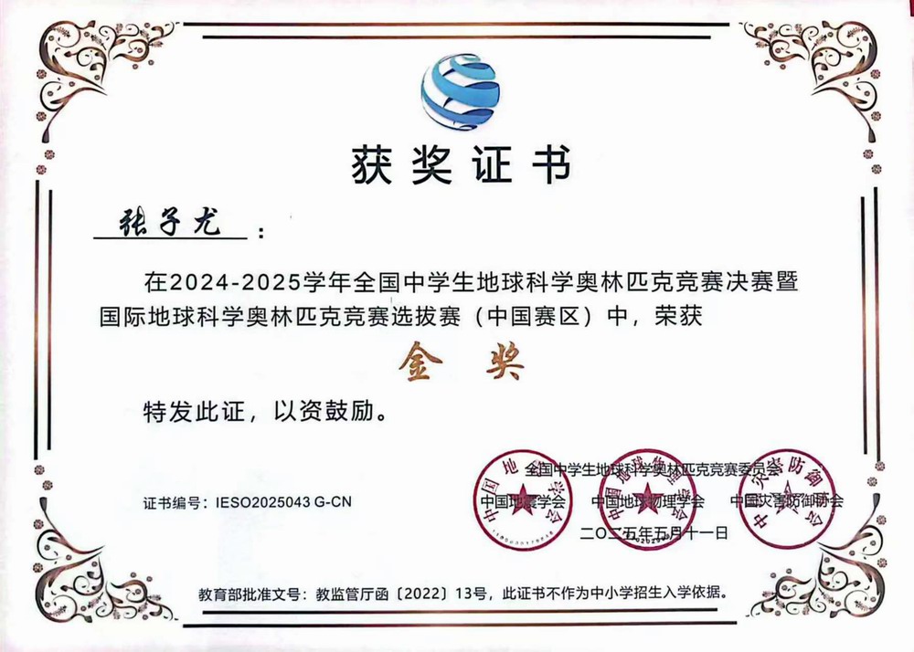 喜报 | 我校张子尤同学在“全国中学生地球科学奥林匹克竞赛”决赛中荣获金奖并入选国家集训队