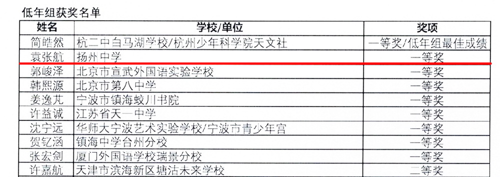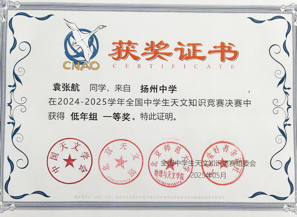 江苏省扬州中学联培部英才C班学子袁张航凭借扎实的天文知识与出色的实践能力,在低年级组竞赛中展现卓越风采,以全国第二名的成绩荣获一等奖。