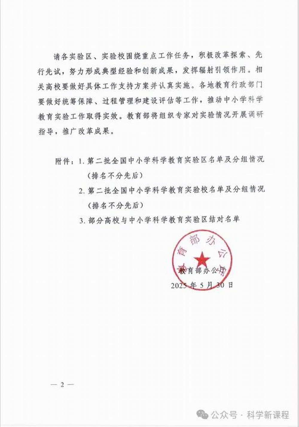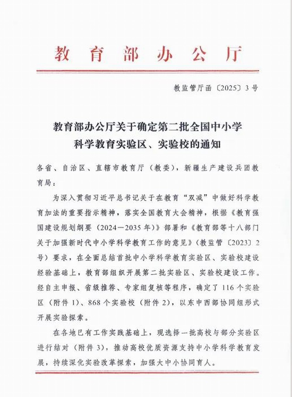 近日,教育部办公厅发布的2025年3号文件正式确定,江苏省扬州中学成功申报为第二批全国中小学科学教育实验校。同时,我校凭借深厚的科学教育实力与卓越表现,担任34协同组组长,这不仅是对我校在科学教育领域长期耕耘的高度认可,更是赋予了我校引领区域科学教育发展的重要使命。