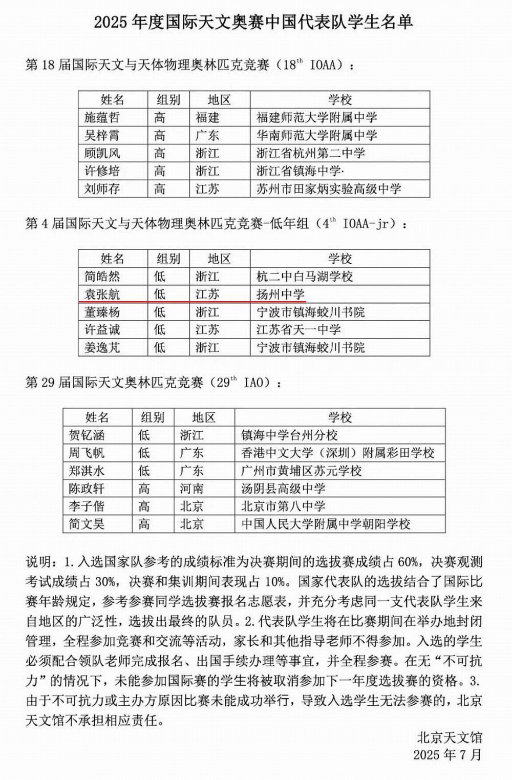 根据决赛选拔赛成绩、决赛观测赛成绩、决赛和集训期间表现等标准,最终确定了2025年度国际天文奥赛中国代表队学生名单。江苏省扬州中学联培部英才班袁张航同学入选中国国家队! 在此,向袁张航同学及天文指导老师顾佳佳表示祝贺!
