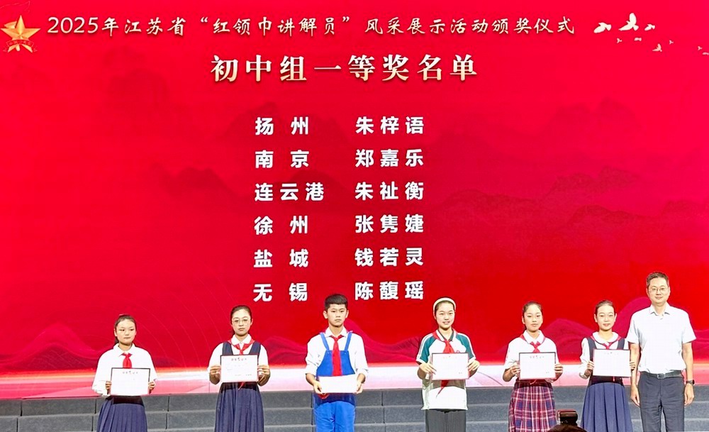 7月25日,在江苏淮安举行的2025年江苏省“红领巾讲解员”大赛中,扬州市代表队传来捷报——扬州中学联培部求知A1中队的朱梓语同学以沉稳的台风、创新的展示和扎实的素养,从全省选手中脱颖而出,凭《一纸童音》主题讲解勇夺初中组一等奖,为扬州赢得荣誉!