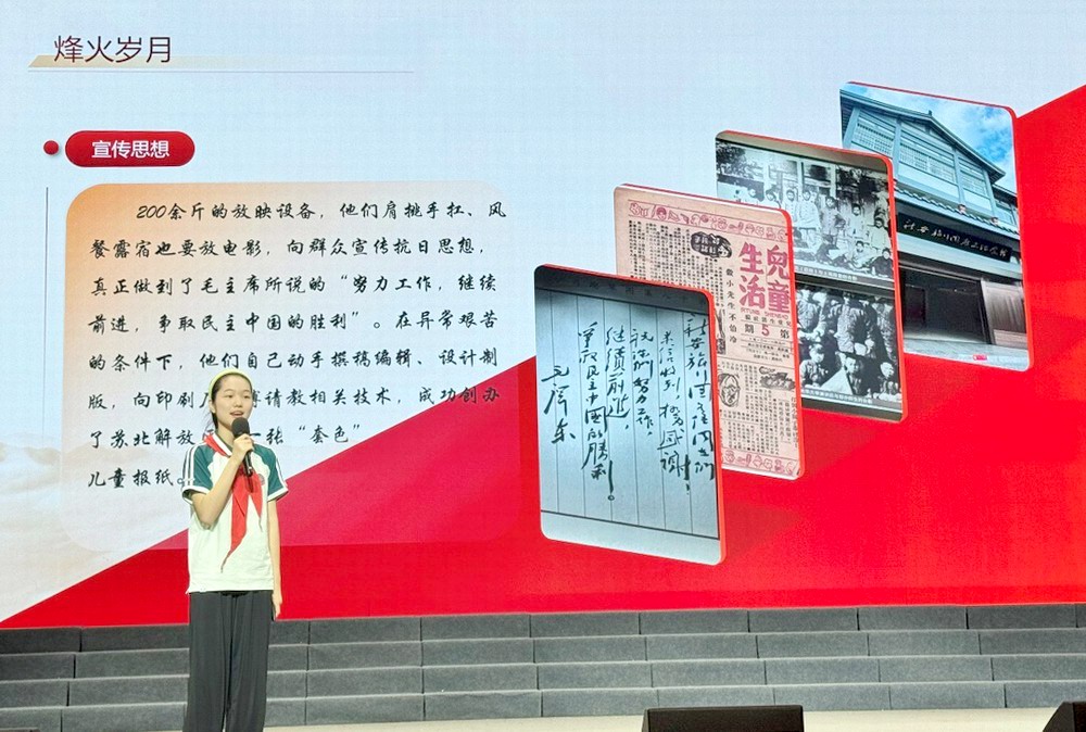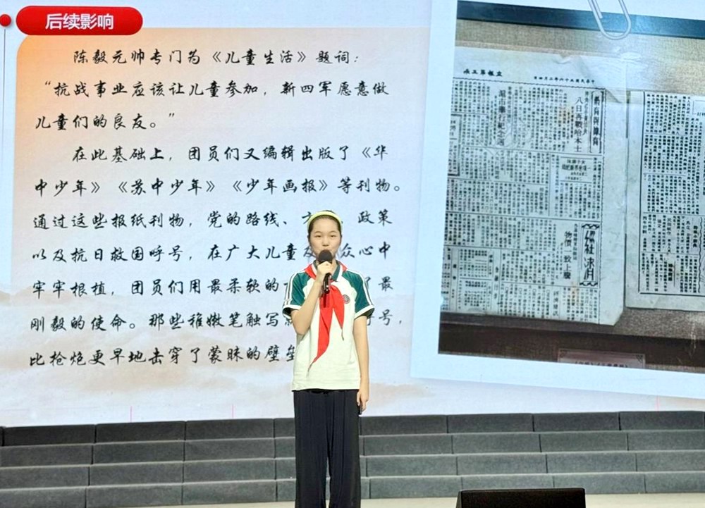 朱梓语把镜头聚焦到展馆中的《儿童生活》,这是苏北解放区第一张“套色”儿童报纸。该报诞生于抗日烽火,不仅囊括革命历史故事、英雄人物传记,还刊登各地少年儿童活动通讯、模范儿童团和儿童团员介绍。《儿童生活》版面丰富活泼,插图生动有趣,稚气却又满载孩子庄严疾呼,深受小读者的广泛欢迎,同时还为农村扫盲活动起到了积极作用,更是为盐阜地区开展抗日宣传活动作出了卓越贡献。陈毅专门为《儿童生活》题词:“抗战事业应该让儿童参加,新四军愿意做儿童们的良友。”在此基础上,新安旅行团又编辑出版了《华中少年》《苏中少年》《少年画报》等刊物。通过这些报纸刊物,党的路线、方针、政策以及抗日救国呼号,在广大儿童及民众心中牢牢根植。朱梓语设计的PPT逻辑清晰,串联起新安旅行团的宣传足迹与当代青少年的使命传承,演讲情感真挚,赢得评委一致高分。
