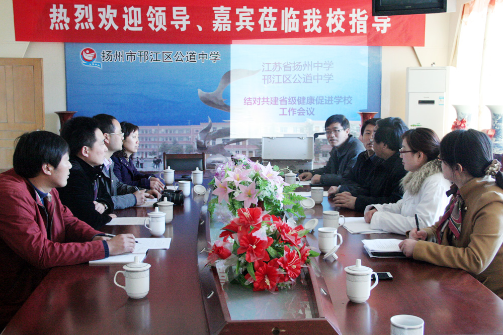 邗江区公道中学领导、老师在沈文涛校长的带领下,与我校领导、教师进行了热烈交流。公道中学是我校创建省级健康促进学校的共建合作单位。交流会上,公道中学沈校长向我们介绍了学校的师生在校情况、学生的学习、住宿和生活等各方面内容,我校朱校长也积极与公道中学领导进行学校健康教育、制度管理上的交流。讨论中,两校领导重点交流了各自在创建省级健康促进学校方面的心得体会,并对会议内容进行记录,以便对今后的工作进行相互指导和相互促进。