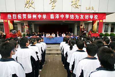 9月15日下午,我校与高邮市临泽中学结为友好学校的庆典仪式在高邮市临泽中学举行。扬州市教育局王玉军副局长及师范师资处领导、高邮市人民政府钱富强副市长、高邮市教育局王有益局长及局有关处室领导出席了庆典仪式。