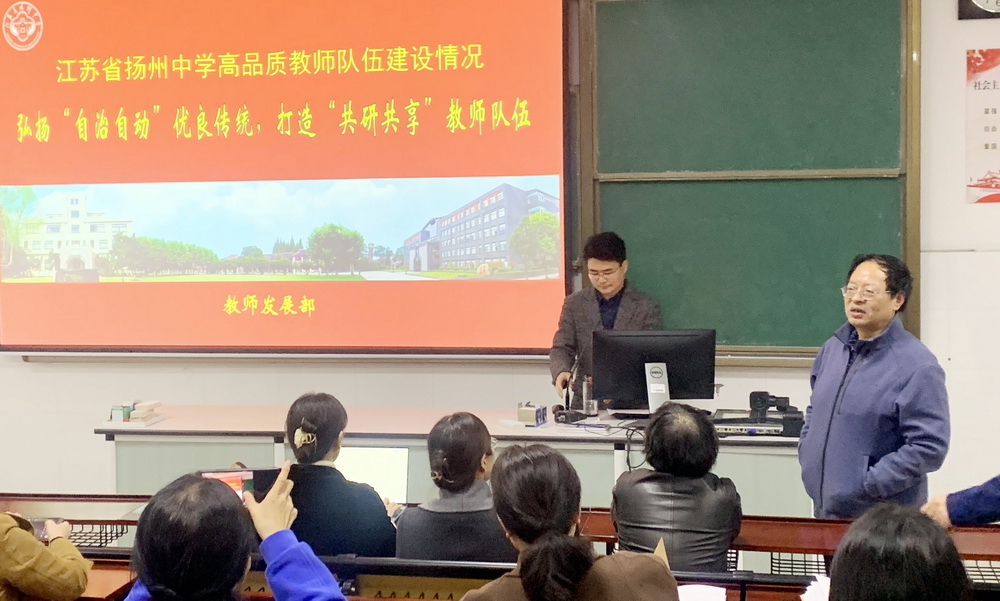 4月6日,由河南省教育厅主办、南京师范大学承办的河南省中原名师和教研名家培育对象高级研修班一行36人到访扬州中学。南京师范大学教师教育学院党委书记黄菊香、河南省中原名师项目办负责人吴玉华等工作人员随同参访。我校教务处主任吴高扬作了《五育融合促成长自治自动谱新篇——高品质课程与教学》专题报告,教师发展处副主任李兆凯作了《弘扬自治自动优良传统,打造共研共享教师队伍》专题报告。