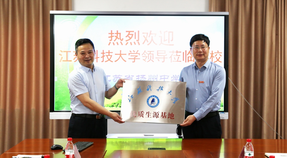 随后,江苏科技大学党委常委、副校长潘锦全代表江苏科技大学向我校授予“优质生源基地”牌匾,副校长丁爱军代表学校接受牌匾。授牌仪式后,潘锦全介绍了江苏科技大学的基本情况。该校是一所以工科为主,特色鲜明的普通高等学校,是江苏高水平大学建设高校,教育部本科教学工作水平评估优秀学校,教育部卓越工程师教育培养计划高校。是一所以“船舶、海洋、蚕桑”为特色优势,具有本硕博完整培养体系的行业特色型大学,努力培养适应社会和行业发展需要、具有创新意识的应用型高级专门人才,享有“中国造船工程师摇篮”的美誉。该校大力弘扬“江海襟怀、同舟共济、扬帆致远”的“船魂”精神,以服务国家海洋强国战略、“一带一路”建设和社会进步为己任,为我国船舶工业、国防现代化和经济社会高质量发展做出了积极的贡献。潘校长在讲话中还高度赞扬了近年来我校的突出办学成绩,对扬州中学毕业生进入江苏科技大学后的优秀成长给予了充分肯定。