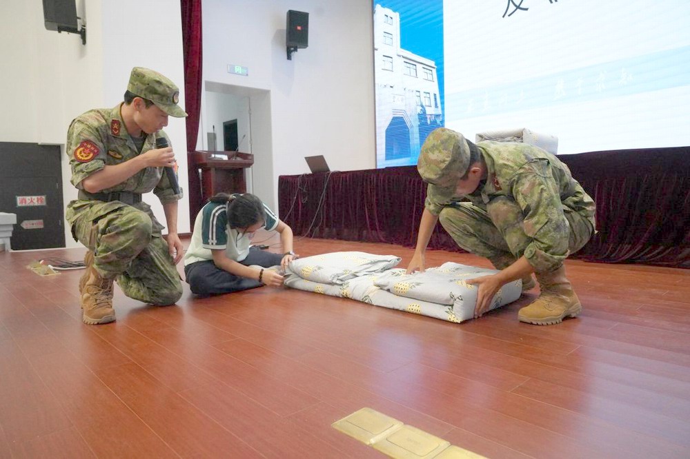 随着两位军训教官迈着铿锵有力的步伐步入会场,全场的目光瞬间聚焦。他们以军人特有的严谨姿态,向在座的新同学们展示了被褥如何通过巧妙的折叠,变成一个个规整的立体长方体,并整齐地摆放在床头。教官们的一举一动都透露出专业与认真,这份专注不仅赢得了学生们热烈的掌声,更激起了大家跃跃欲试的热情。不少同学迫不及待地上台尝试,现场气氛顿时活跃起来。