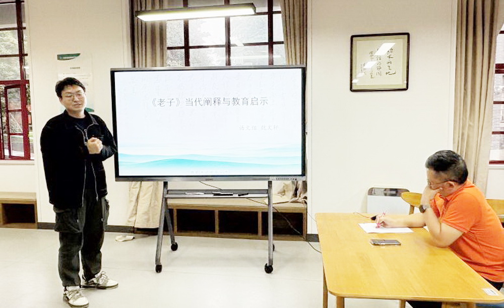 魏文轩老师分享了《老子》这本书,他从老子的生平讲起,围绕着这本书的当代阐释和教育启示向大家展示了自己的心得体会。魏老师将书中的内容与平时的育人实际相结合,阐述了自己的教育感悟:要引导学生理性看待竞争,实现自我超越;作为育人者要多维度评价学生以及尊重学生的人格独立性等。