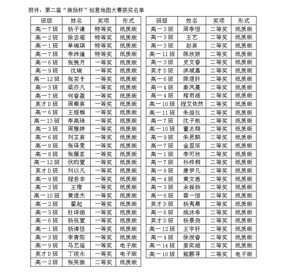 扬州中学第二届“庚扬杯”创意地图大赛,经过两个星期的作品征集和后期高一地理备课组初选、高二地理备课组再选,最终评选出特等奖4名、一等奖24名(含2幅电子地图)、二等奖29名(含1幅电子地图)。