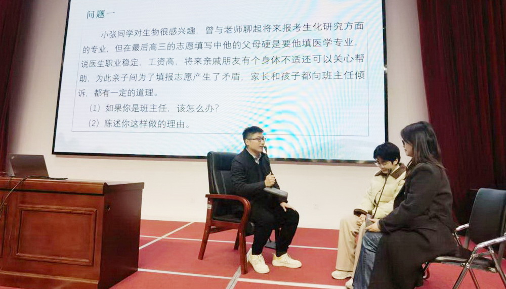 情境一涉及主题为高考志愿,汪飞老师扮演班主任,脱颖老师、王然老师助演。面对学生和家长在高考志愿填报上的迷茫和分歧,参赛教师汪老师通过深入了解学生兴趣和成绩,结合专业指导老师的建议,制定了一份个性化的志愿填报方案。