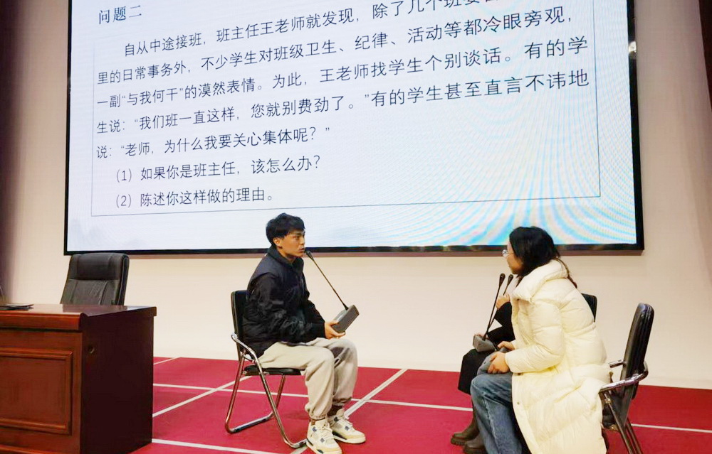 情境二涉及主题为关心集体,曹仲允老师扮演班主任,熊晨晖老师、项笑老师助演。针对班级凝聚力不足的问题,参赛教师曹老师提出了“晓之以情、动之以理”的解决方案,逐步形成了积极向上的班级氛围。