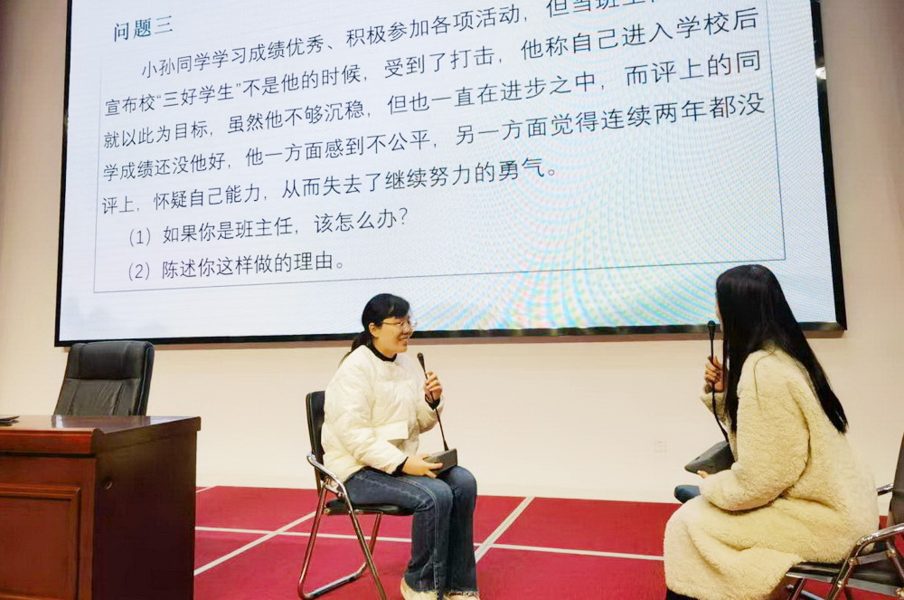 情境四涉及主题为家校互信,徐尧老师扮演班主任,凌晨老师、魏研欣老师助演。针对新教师与家长之间的沟通问题,参赛教师徐老师主动了解学生在家的表现,帮助解决家校沟通中的障碍,展现了对于新时代的师生关系的思考。