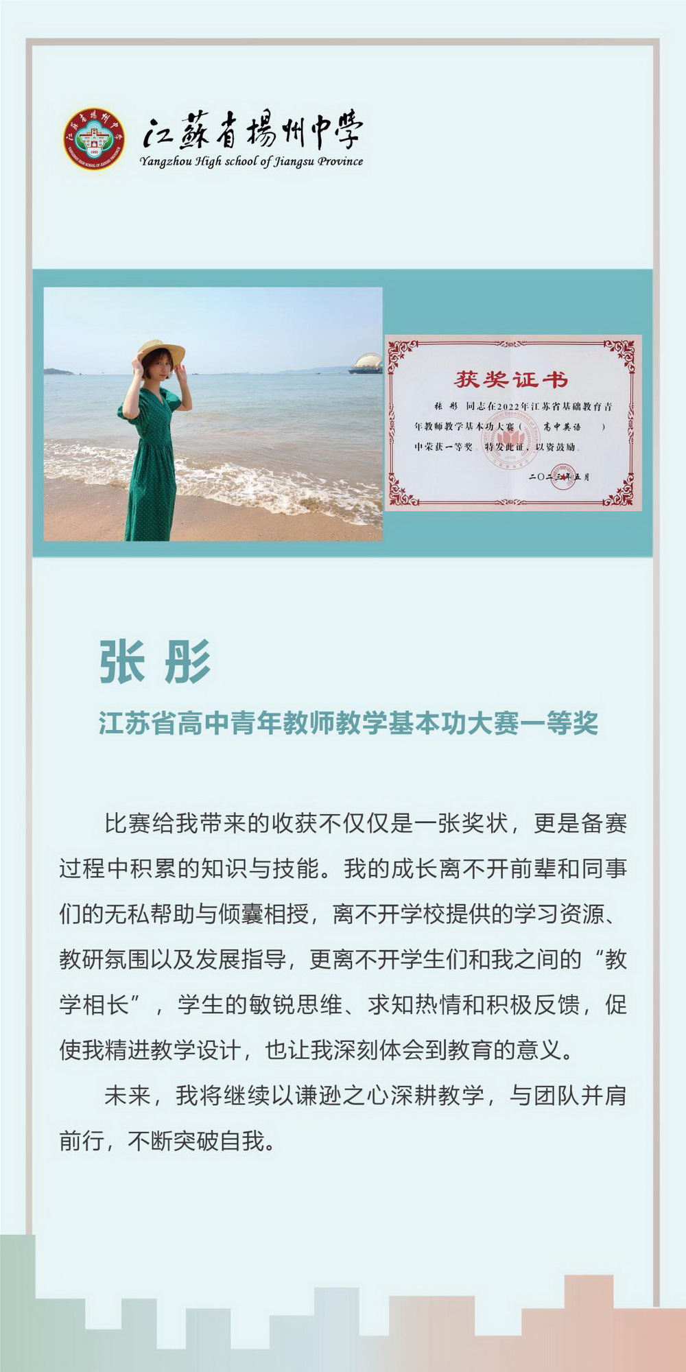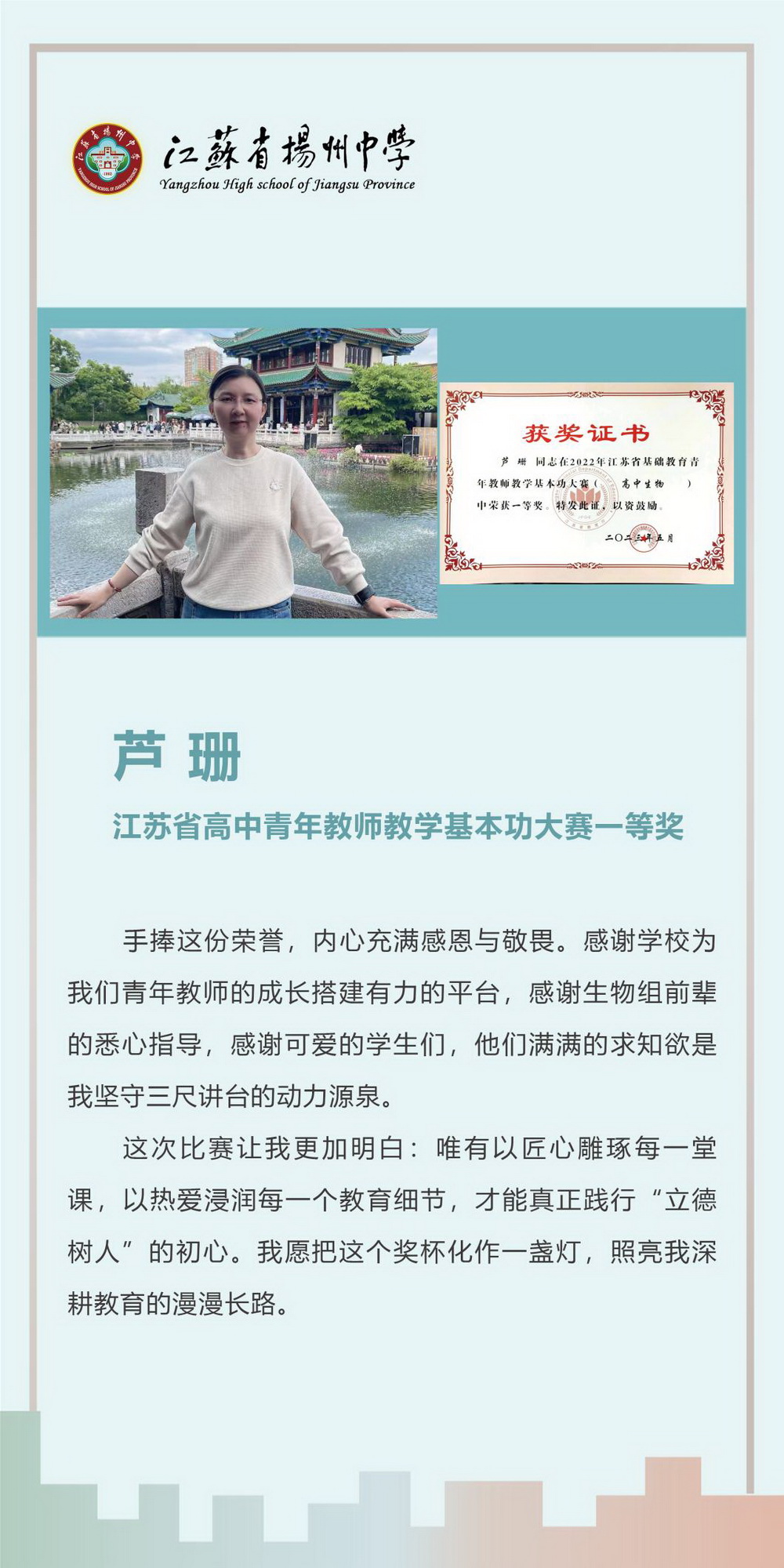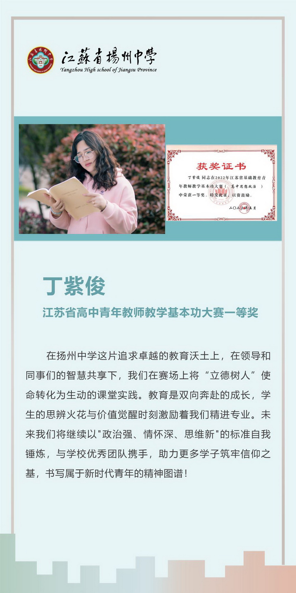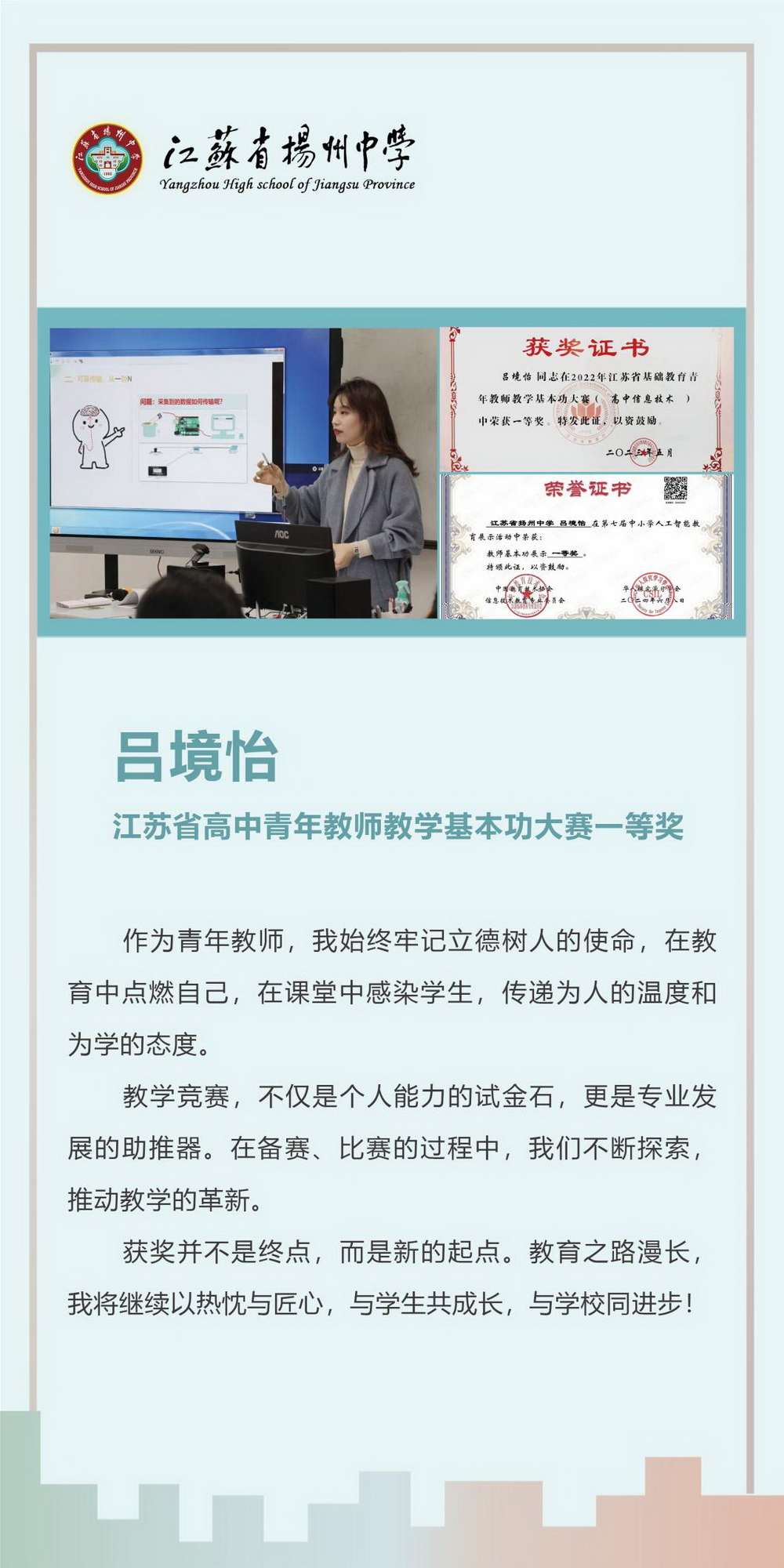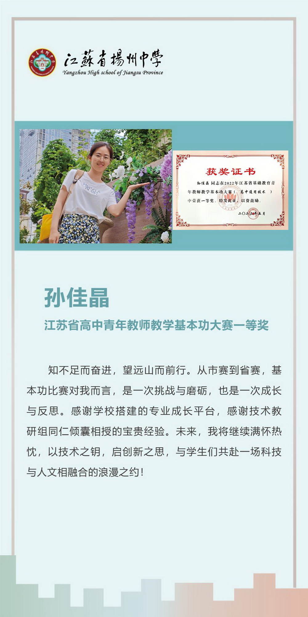 教师是学生成长的引路人,扎实的教学基本功是教师必备的专业素养。江苏省扬州中学教师团队始终秉持精进育人之志,一方面夯实教学基本功,在日常授课中不断锤炼课堂教学;另一方面关注学生成长,在课堂中注重培育学生的学科核心素养。学校构建了多维成长平台,通过青蓝工程、学科教研日活动、公开课展评等方式,助力青年教师突破专业发展瓶颈。近年来,在青年教师教学基本功大赛的舞台上,我校教师凭借深厚的积淀与创新的智慧屡创佳绩。希望更多优秀的青年教师加入这支奋进之师,共同书写育人新篇章。