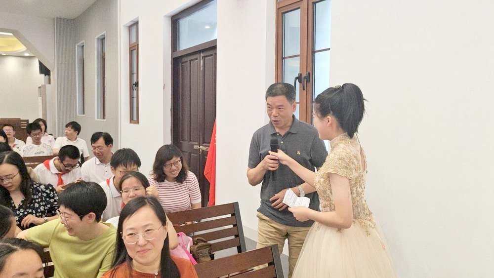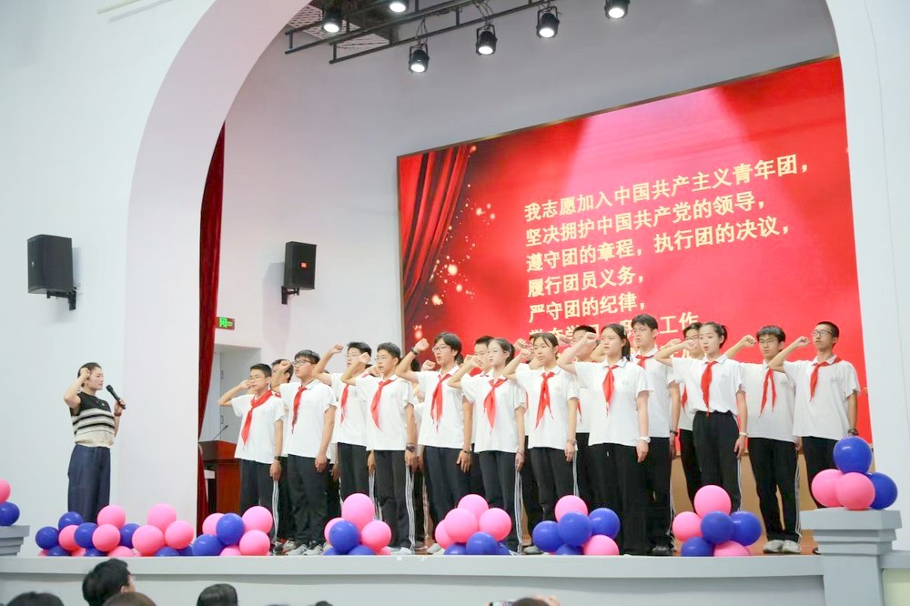 仪式在激昂的音乐声中拉开帷幕,主持人伏屿轩、秦艺、蒋卓昀、张瑗桐精神抖擞地登上舞台。他们用饱含激情的话语,讲述着青春的意义,“14岁,是告别童年的驿站,更是拥抱未来的起点”,瞬间点燃了现场的气氛,拉开了仪式的序幕。紧接着,全场人员起立,在雄壮的国歌声中,少先队员们行着标准的队礼,目光坚定地注视着五星红旗缓缓升起,爱国之情在每个人心中油然而生。在“成长——我们在队旗下成长”篇章,出旗仪式庄严肃穆。护旗手们迈着整齐有力的步伐,护卫着队旗走向舞台中央。那飘扬的旗帜,仿佛承载着同学们过往的努力与未来的憧憬,指引着他们在青春的道路上奋勇前行。随后,主持人宣读新团员名单,新团员们迈着自信的步伐有序上台。学校团委朱夙文书记、联培部刘岚老师、殷琳老师亲自为新团员们佩戴团徽,团徽在阳光下闪耀,象征着新团员们开启了人生新的征程。新团员们怀揣着对祖国的热爱,在团旗下庄严宣誓,誓言铮铮,彰显着他们的责任与担当。
