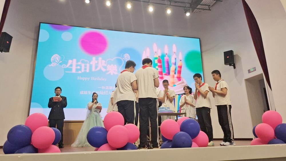 活力四射的舞蹈《青春修炼手册》将仪式推向高潮,同学们用跳动的音符和绽放的笑颜,展现了青春的无限可能。本月过生日的同学上台与大家共度难忘的生日,联培部陈洪松主任为大家切蛋糕,全场共同唱响生日歌,温馨的氛围弥漫在整个会场,每个学生都收到自己的十四岁生日蛋糕,香甜的蛋糕承载着师长的期许和同窗的情谊。随后,洪圣火同学带领全体同学庄严宣誓,以青春的名义许下承诺:迈入青春之门,走好人生之路,牢记家国期盼,不忘师长教诲,用智慧培育理想,用汗水浇灌希望。这誓言不仅是对青春的承诺,更是对未来的坚定信念。