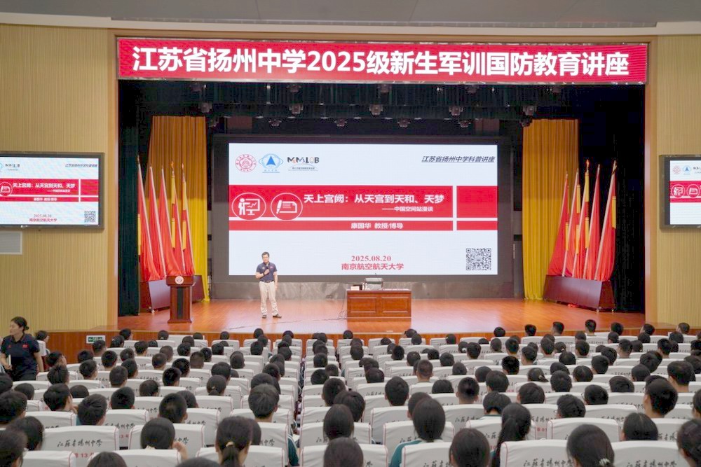 8月20日,扬州中学2025级高一新生军训拉开序幕。为激发同学们的国防意识,鼓励同学们立志逐梦,学校特邀请南京航空航天大学教授、博士生导师康国华教授为同学们做“天上宫阙:从天宫到天和、天梦——中国空间站漫谈”讲座。活动由团委副书记朱夙文主持。
