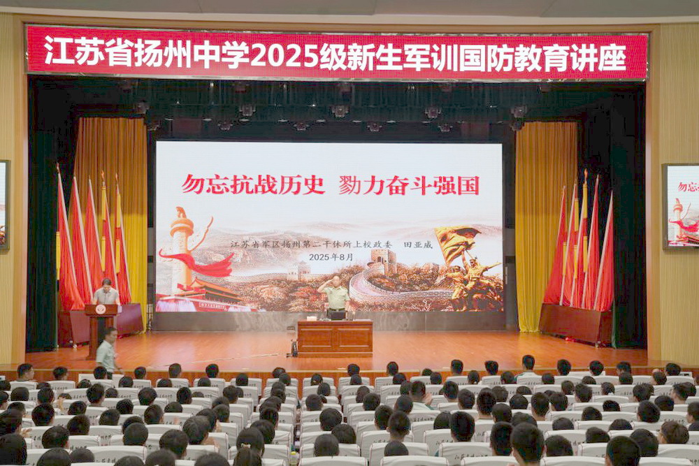 8 月21日,我校特邀江苏省军区扬州第二干休所上校政委田亚威莅临军训现场,以《勿忘抗战历史戮力奋斗强国》为题开设专题讲座,为师生带来深刻的爱国主义与国防教育 “精神盛宴”。