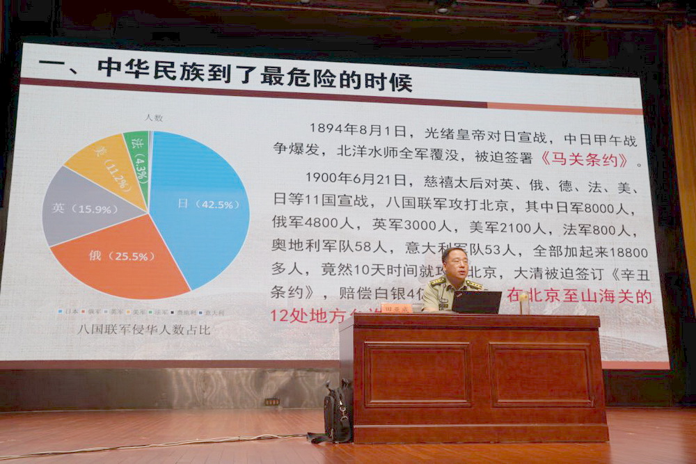 “历史是最好的教科书,也是最好的清醒剂。” 讲座伊始,田亚威政委以沉稳而激昂的语调,带领师生穿越回那段烽火连天的岁月。他用一个个鲜活的历史细节、一组组震撼的战争数据,还原了中华民族在抗日战争中浴血奋战、不屈不挠的壮阔史诗。